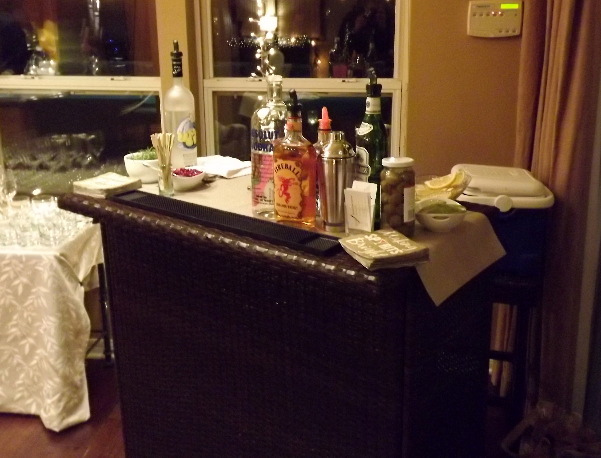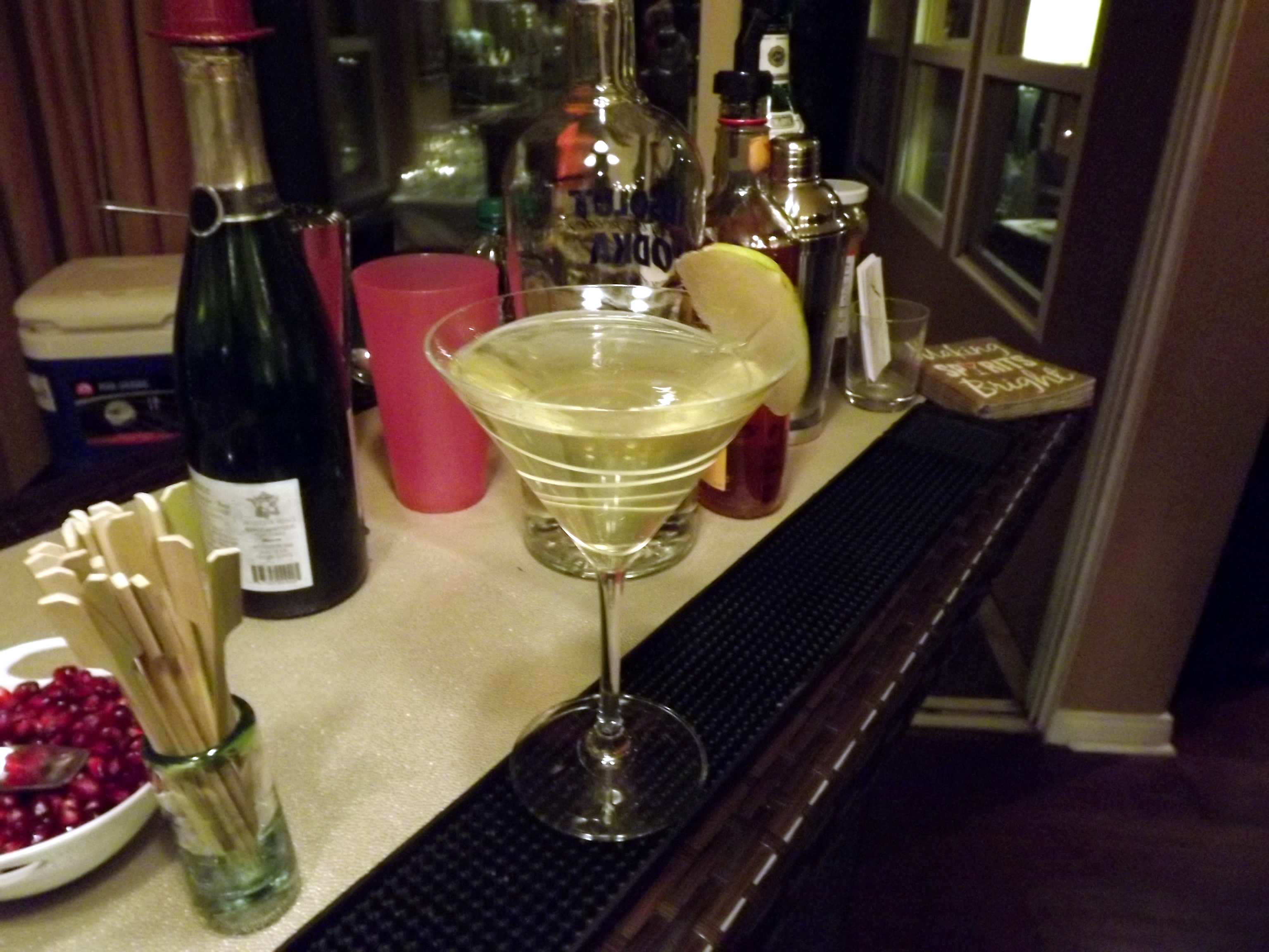 The hostess came up with the specialty drink, which was a Peartini. It was made with Pear infused Grey Goose vodka, a dash of Disaronno, a dash of Sweet and Sour, and topped off with champagne with a pear slice garnish. The drink was a big hit. I came up with a Fireball Martini, which was vodka with a dash of Fireball Whiskey, and a dash of bitters. I don’t know about that one – a couple people said that they liked it, but they didn’t order a second one.