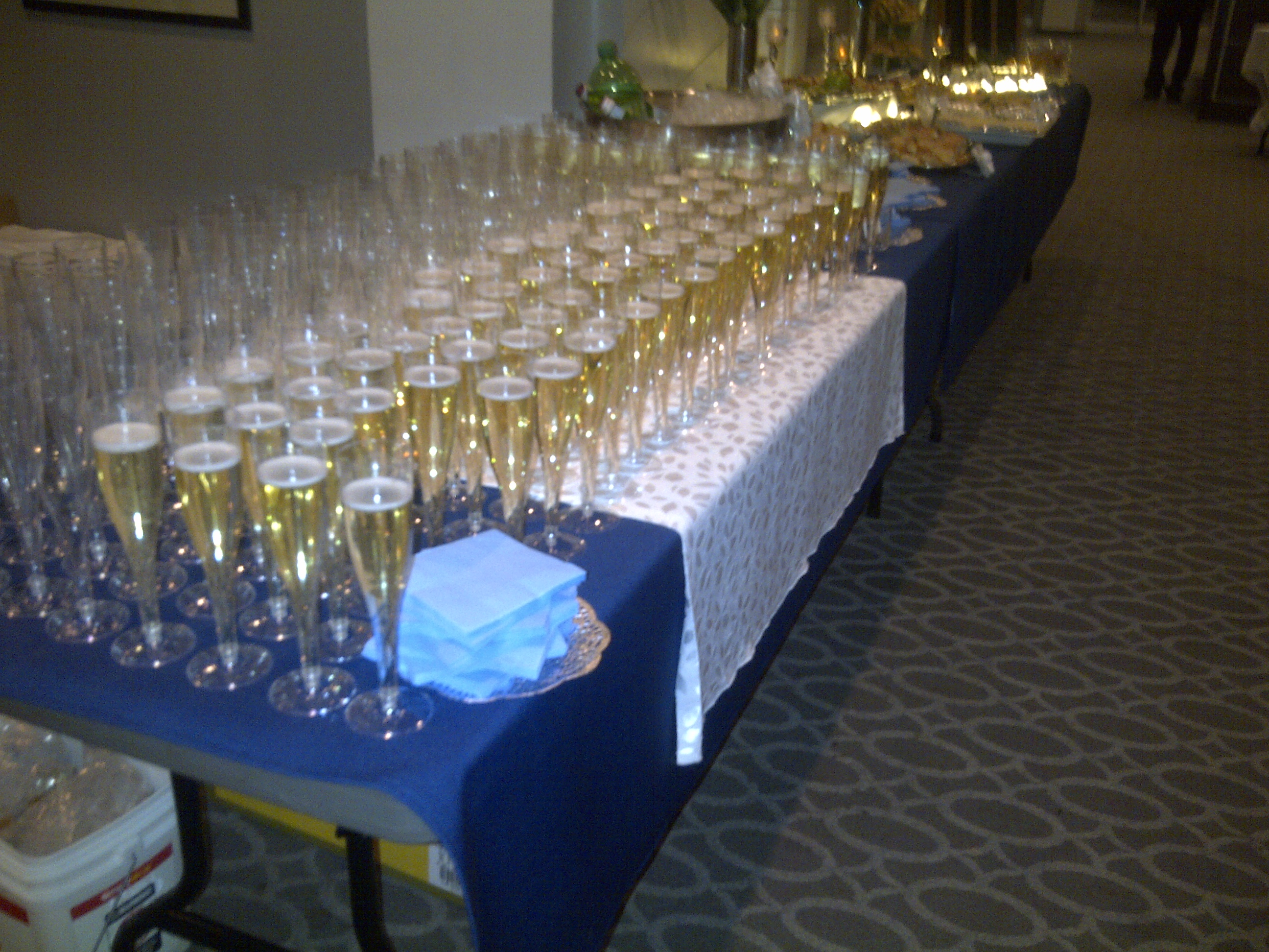 I listened to the service while we were setting up and I must say that the Center for Spiritual Living had some excellent music. As soon as the service was over, the people poured out of the theater and the glasses of champagne I had poured went fast. I poured ginger ale into champagne glasses for non alcoholic drinkers. We went through 18 bottles of champagne for 150 people. A few people came back for a second glass.